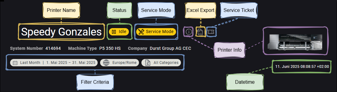 The Printer Details Header provides key contextual information and controls that apply across all sections of the printer details page. It includes the current printer status, essential identifiers like system number, machine type, timezone, and global filter settings.
